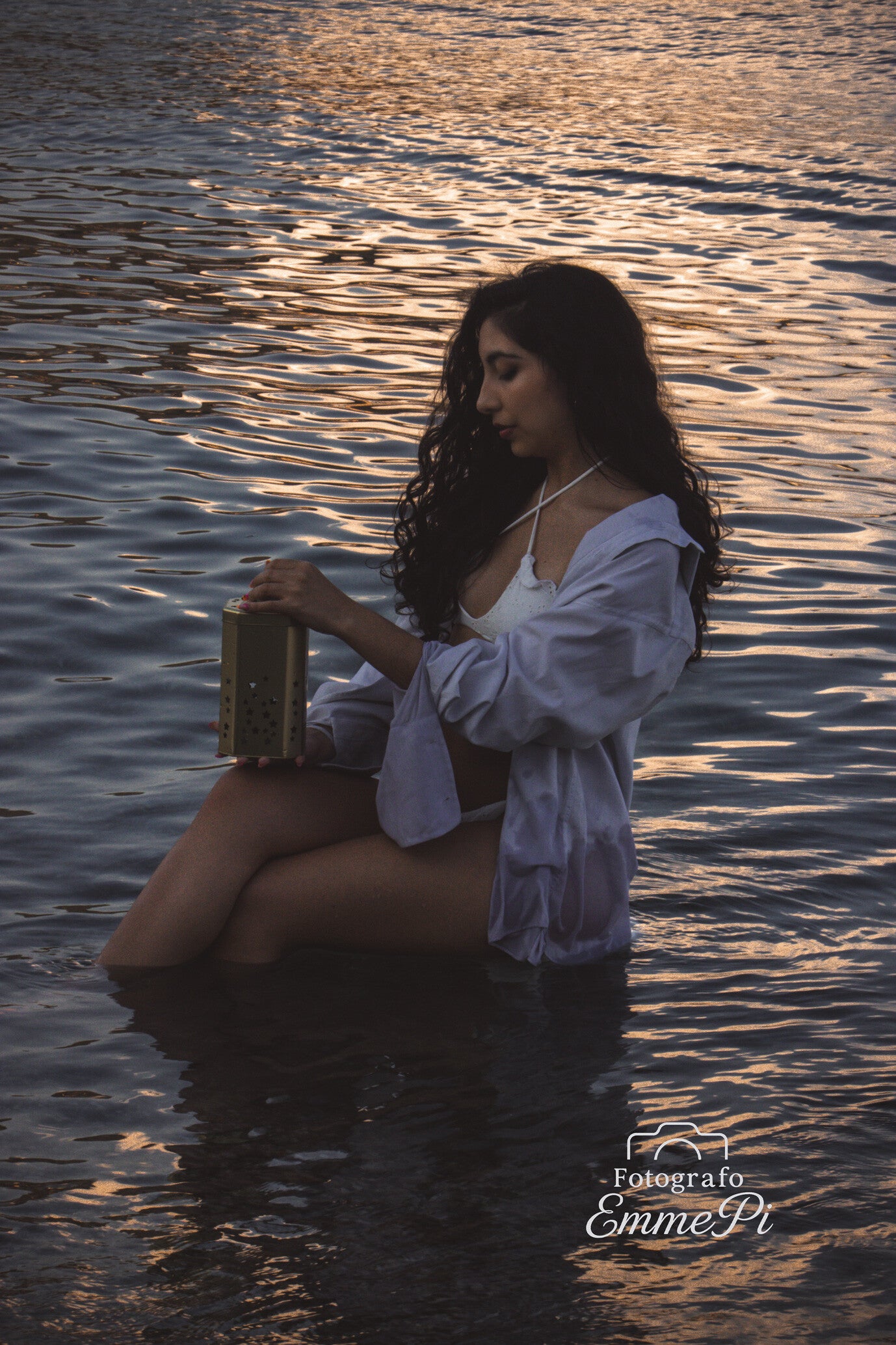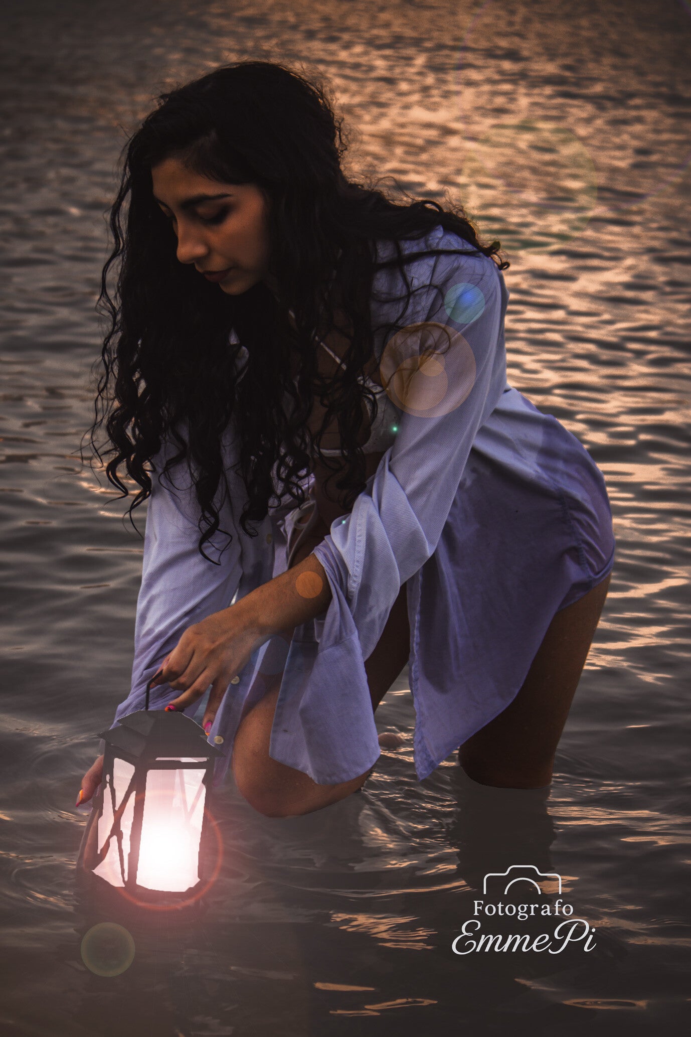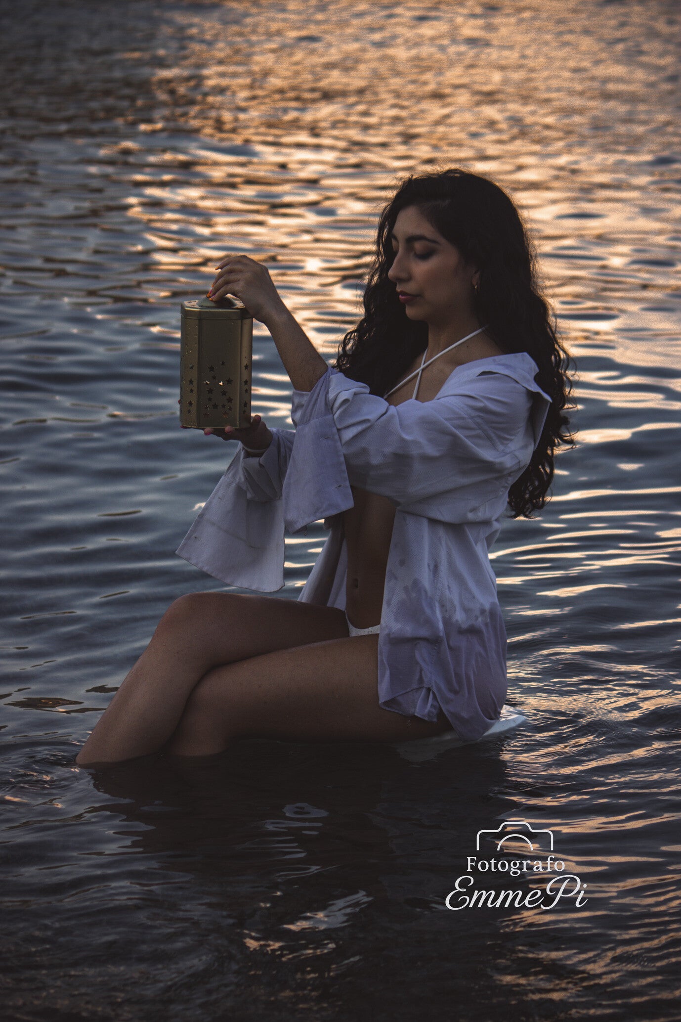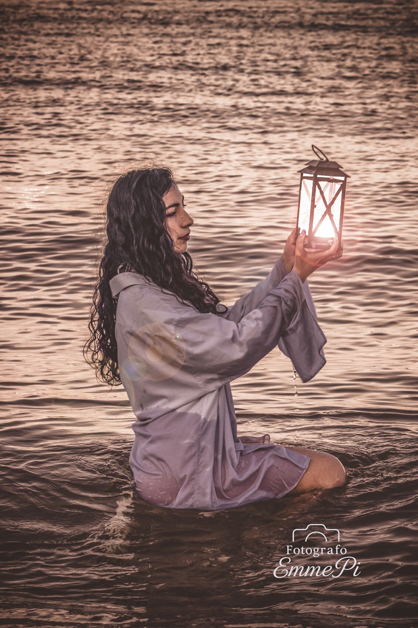 Kimberly, avvolta dall’acqua, porta tra le mani una lanterna: non è un semplice oggetto, ma il segno di una presenza, un chiarore che nasce dall’intimità di un gesto.