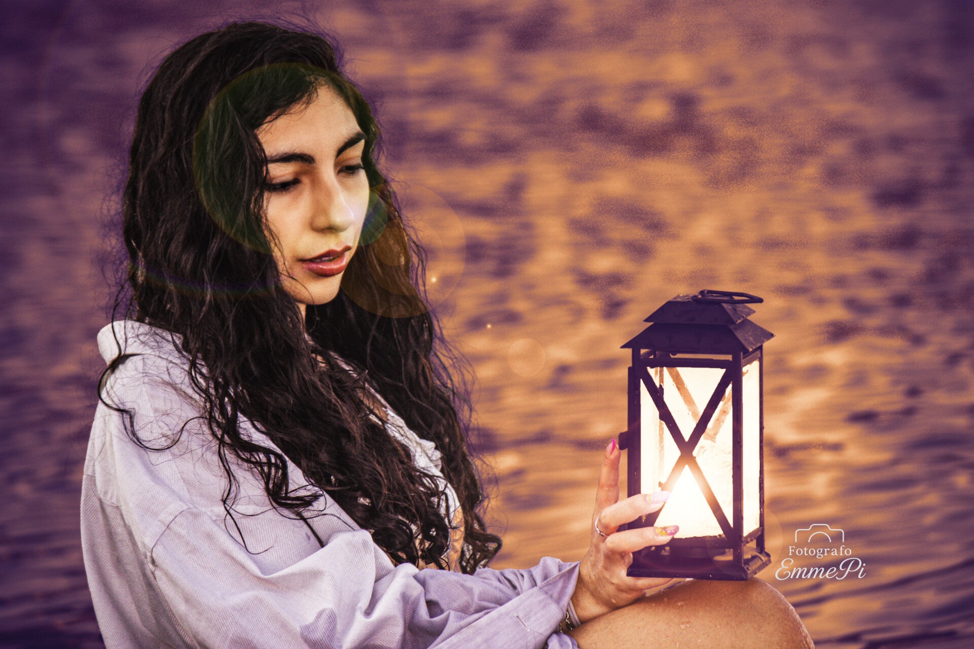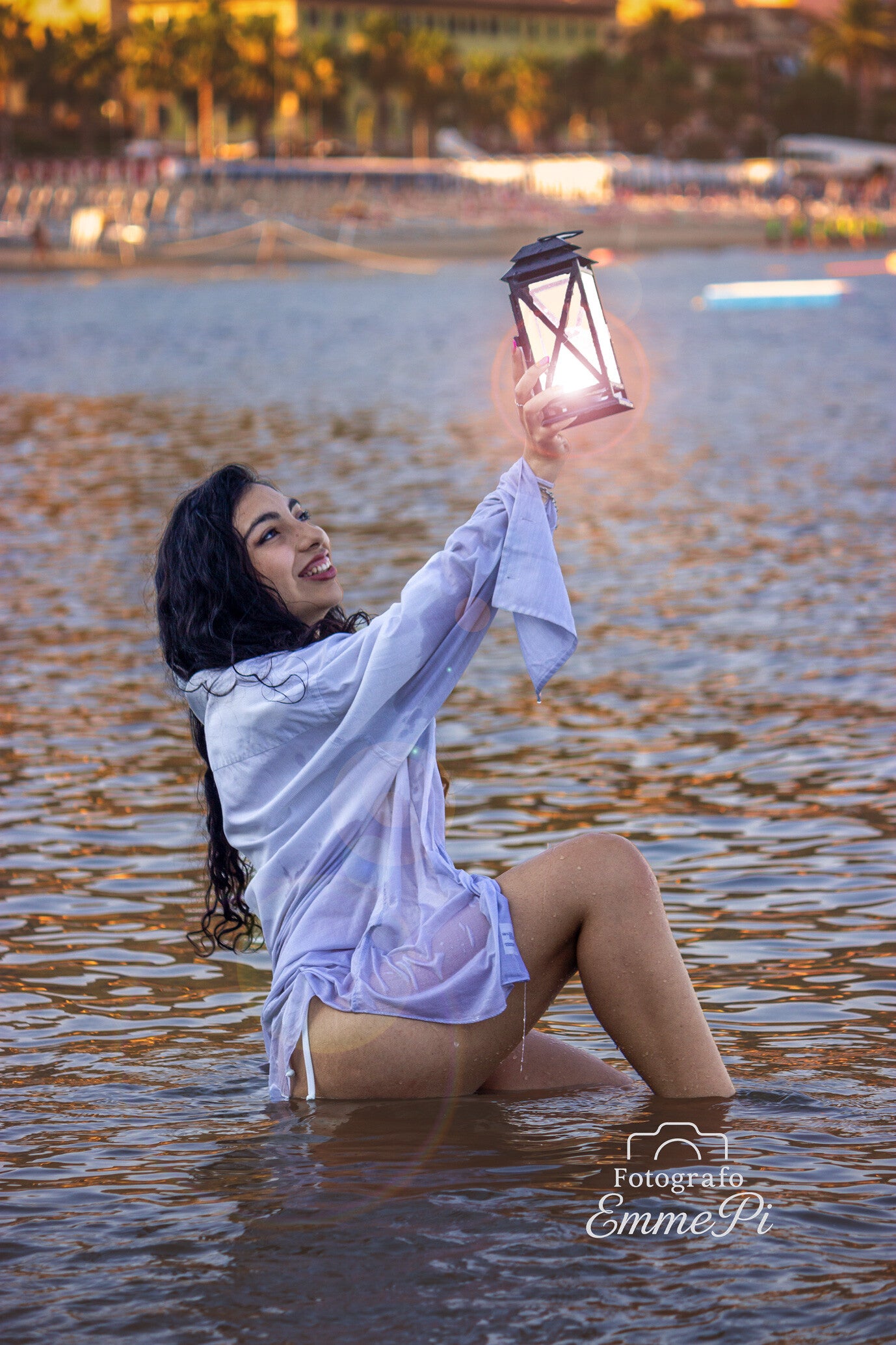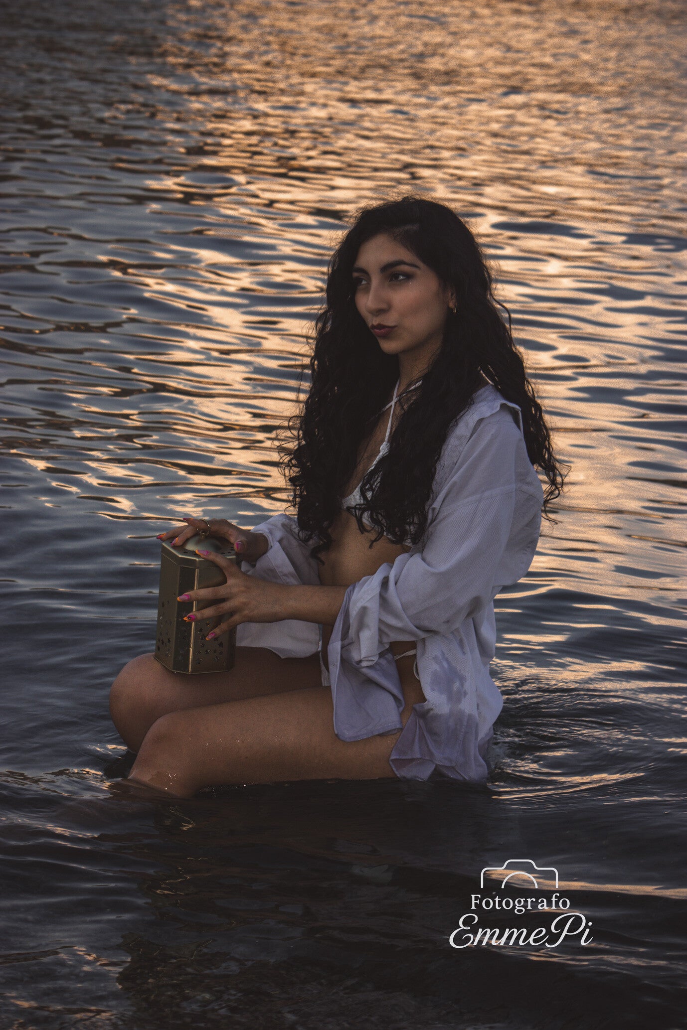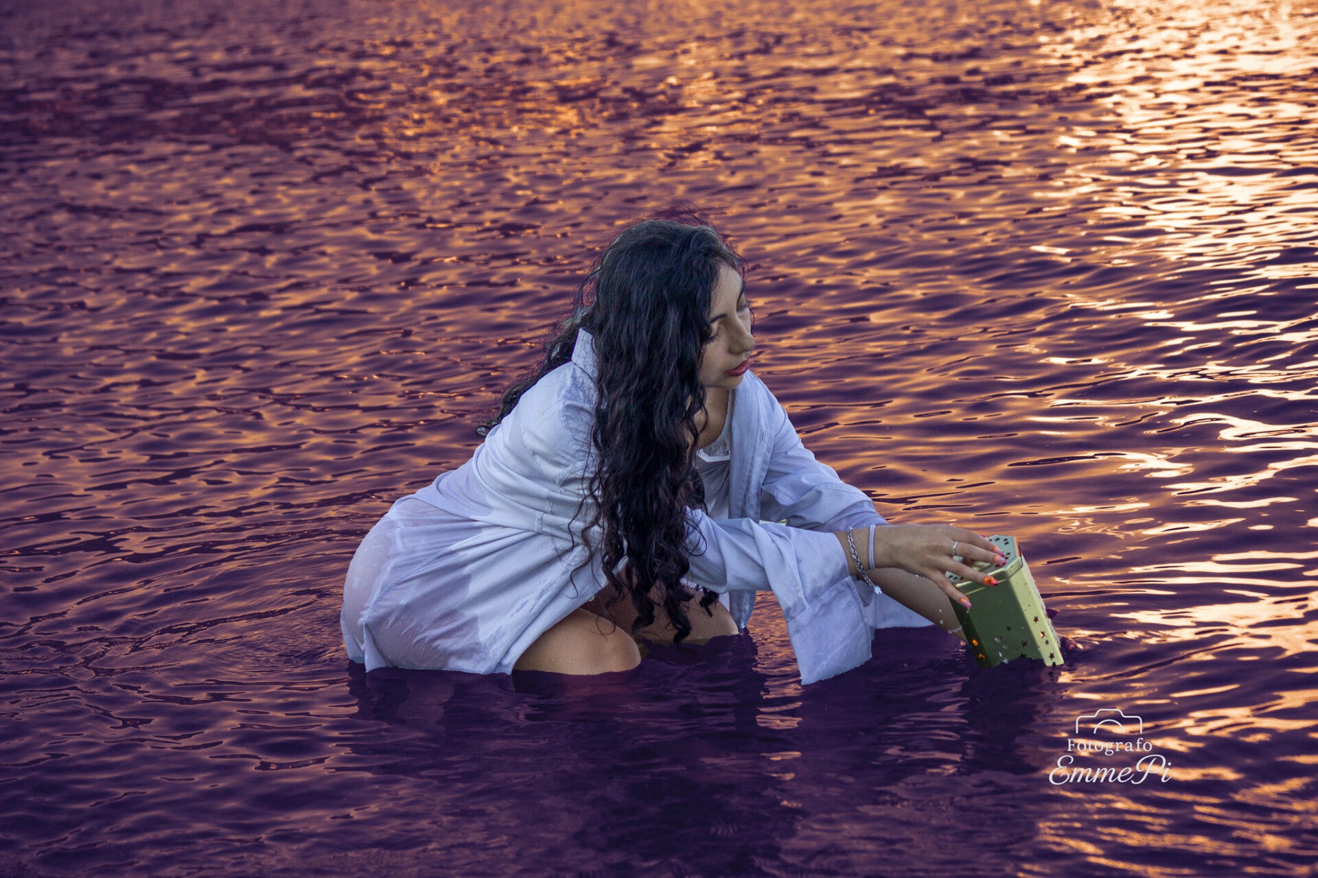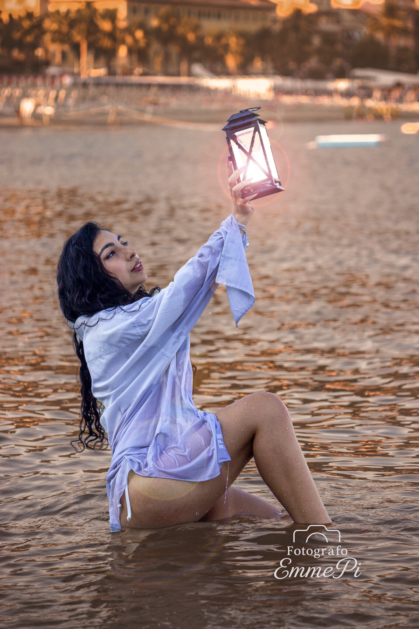 Kimberly, avvolta dall’acqua, porta tra le mani una lanterna: non è un semplice oggetto, ma il segno di una presenza, un chiarore che nasce dall’intimità di un gesto.